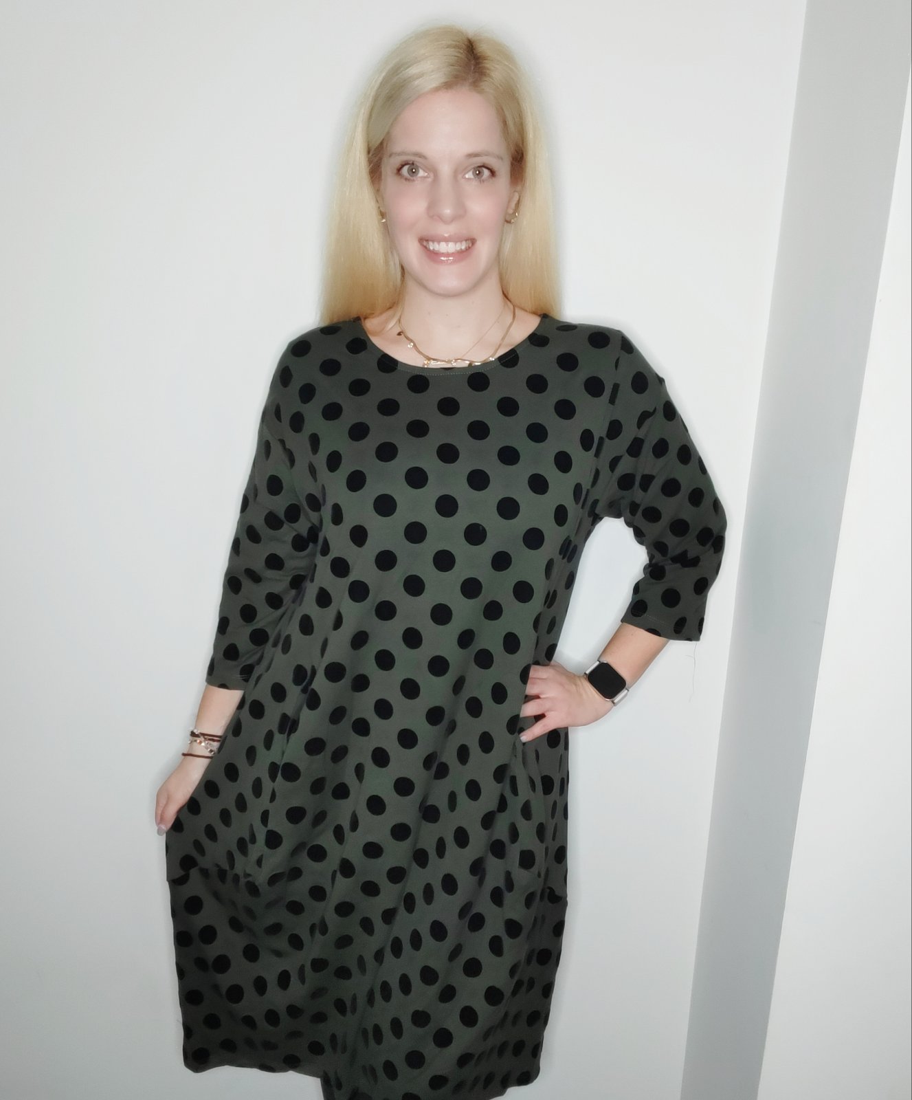 Φόρεμα πουά μακρύ με μανίκι 3/4 και τσέπες μπροστά